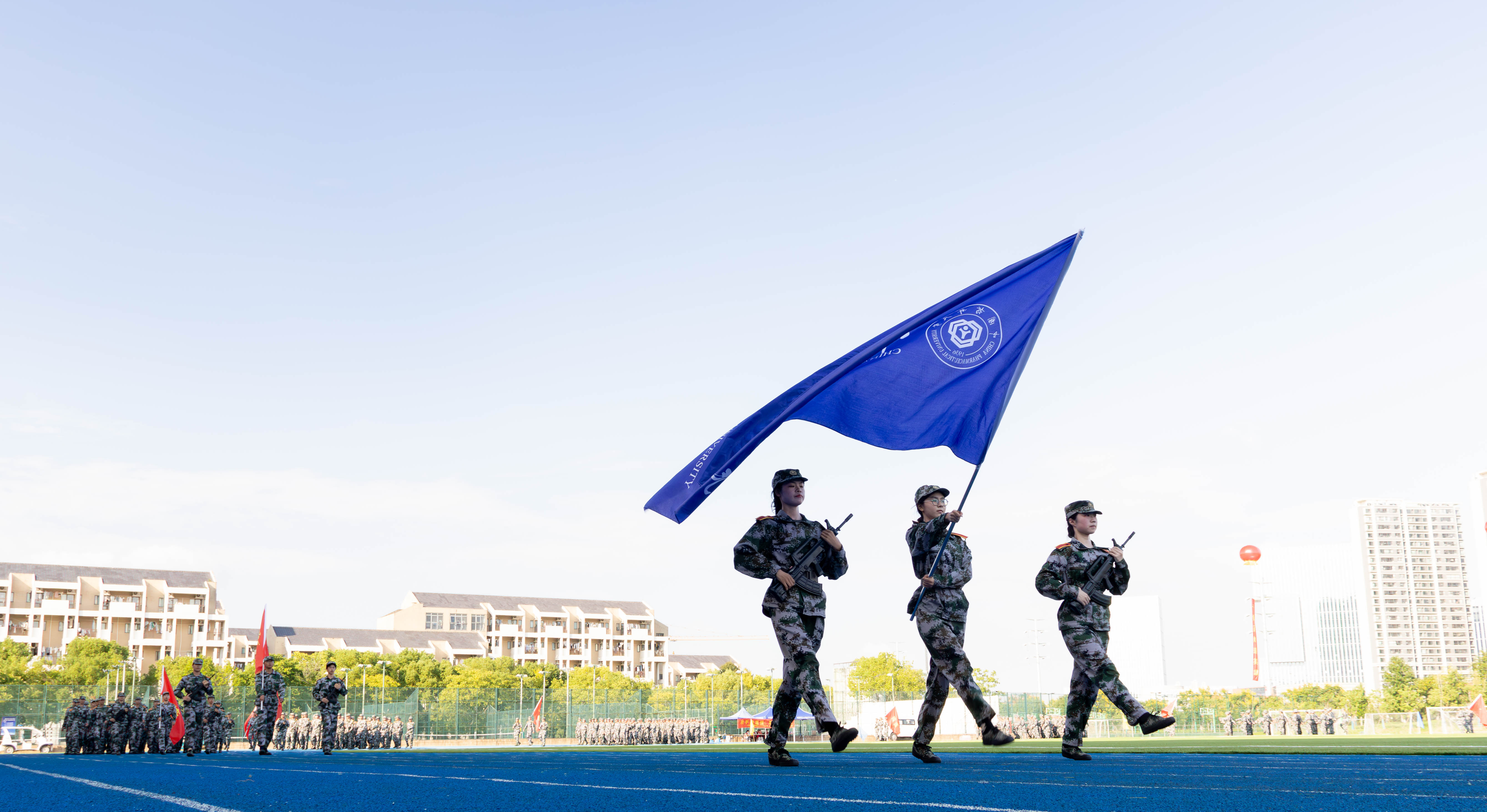 活动在庄严的国歌声中拉开帷幕。展演中,伴随着激昂的分列式进行曲,37支受阅方阵步伐铿锵、整齐划一地依次通过主席台,充分展现了中国药大学子意气风发、斗志昂扬的精神面貌。分列式结束后,各方阵迅速就位,依次进行了棍术、匕首操、军体拳、战场救护、战术对抗等科目演示。同学们动作精准、配合默契,展现出过硬的军事素养和训练成果,赢得现场阵阵掌声。