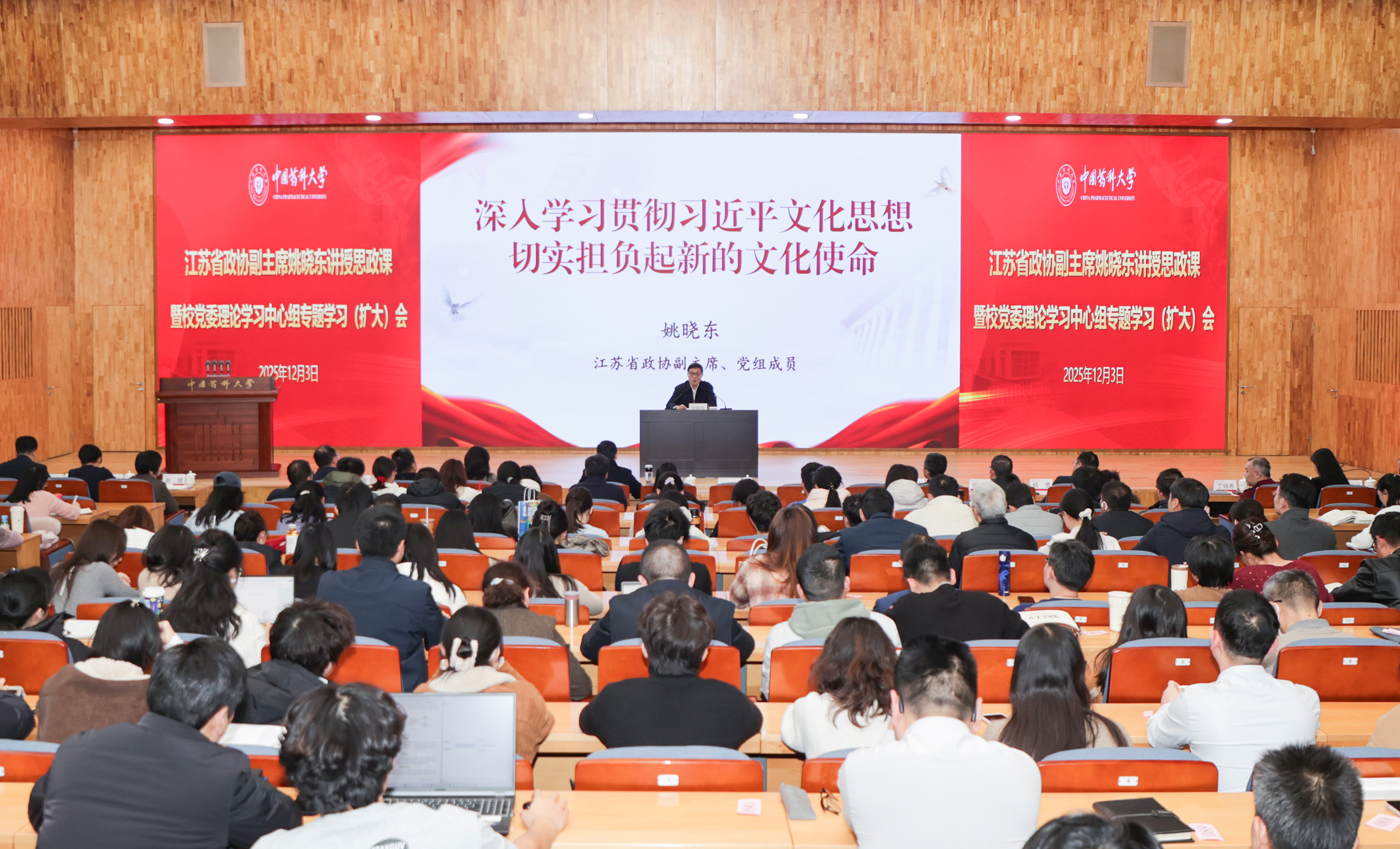 会上,姚晓东以《深入学习贯彻习近平文化思想 切实担负起新的文化使命》为题,从“深刻领悟习近平文化思想的精髓要义”“深刻把握新时代社会主义文化建设取得的突出成就和经验启示”“更好担负起新的文化使命,努力把江苏建设成为习近平文化思想生动实践地”等三个方面,结合江苏发展实际,对习近平文化思想进行了权威辅导和精准解读,为我校师生深入学习领会、全面贯彻落实习近平文化思想,更好地服务江苏文化强省建设大局提供了有力指导。