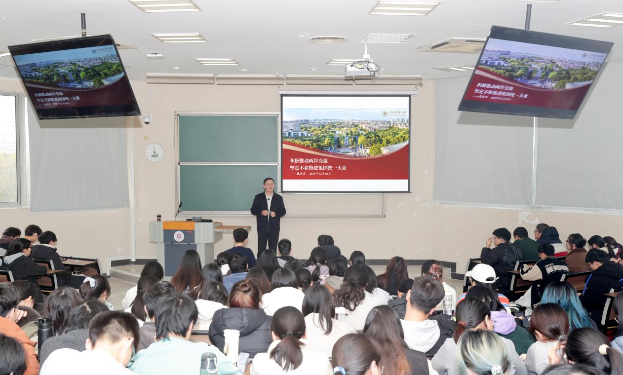 12月10日下午,校党委书记戴建君以“积极推动两岸交流,坚定不移推进祖国统一大业”为主题,为我校2023级药学1-6班和药学(诊断试剂方向)班本科生讲授“形势与政策”课。相关职能部门、马克思主义学院、药学院负责人,思政课教师以及辅导员代表旁听课程。