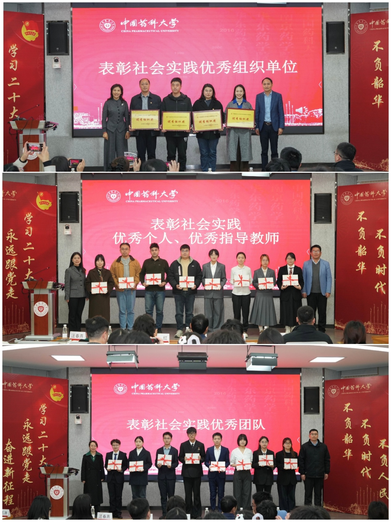 大会对在今年暑期社会实践活动中表现优秀的学生、指导教师、实践团队和组织单位进行了表彰。6支优秀社会实践团队围绕活动策划、推进实施、成果转化及育人成效等进行现场分享。药学院本科生唐思农、理学院辅导员张旭、国际医药商学院党委副书记赵瑾等分别从实践个人、指导教师和组织单位视角,分享参与、指导及组织社会实践的思考与体会。