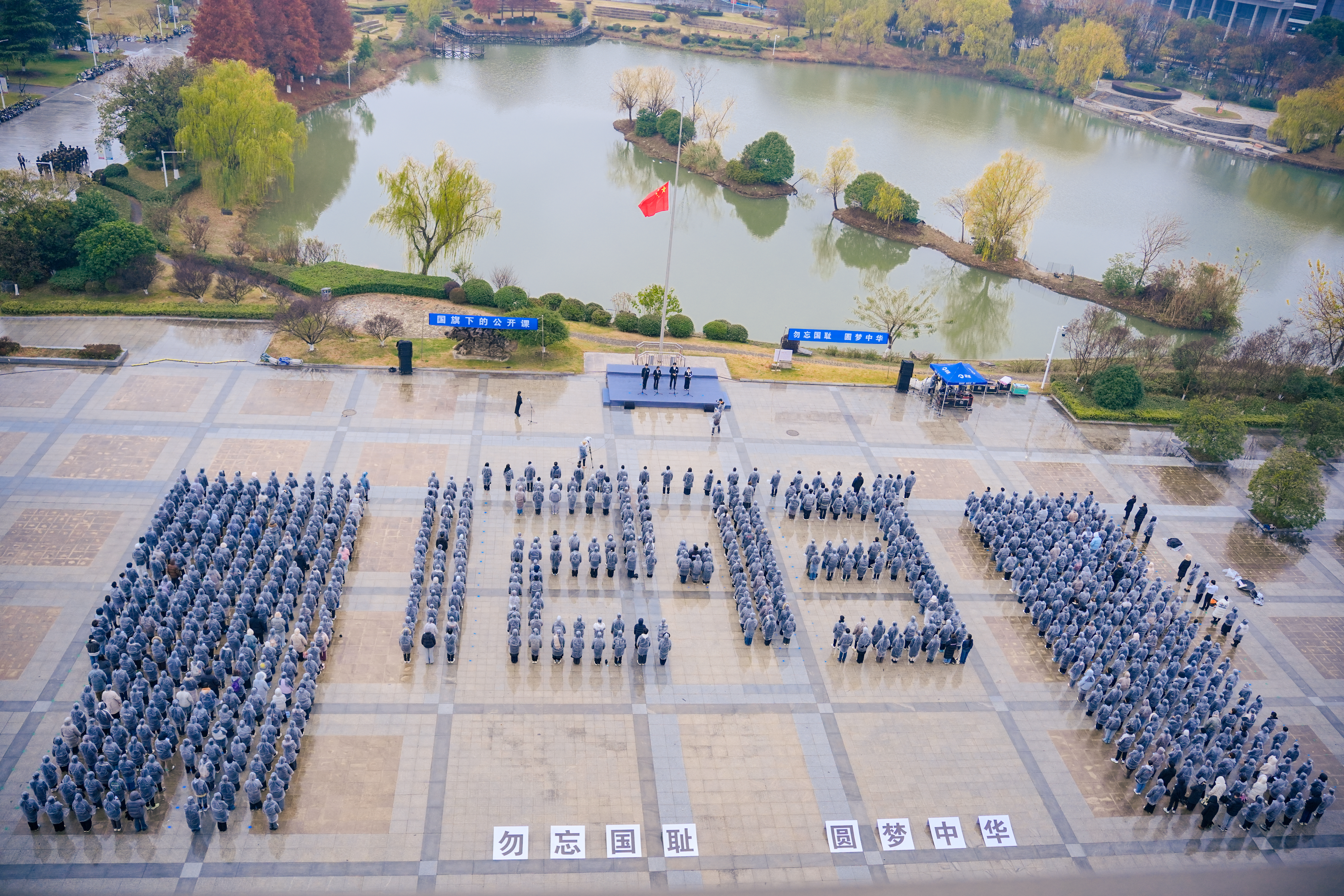 细雨霏霏、寒意肃穆。上午8时,校国旗护卫队迈着整齐的步伐护送国旗入场,全体师生庄严注目。伴随着雄壮的国歌声,五星红旗缓缓升起,至顶端稍作停留后,降半旗致哀。广场上,800余名师生胸前佩戴白花,静静肃立,现场摆出“12·13”字样,以示哀悼。