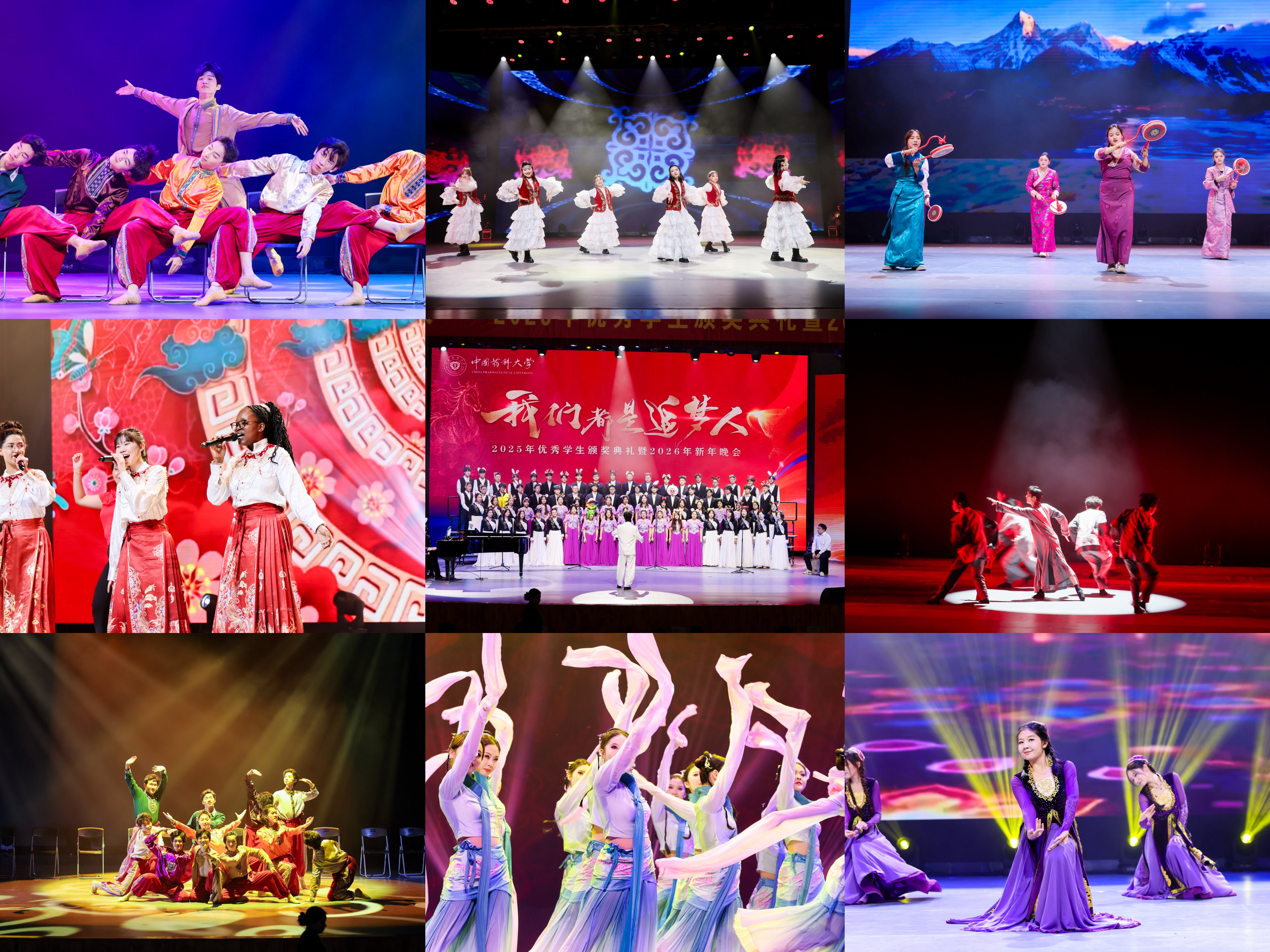 2026年新年晚会在红叶舞蹈团演绎的创意舞蹈《采薇》中诗意启幕,同学们舞姿翩跹,充分展现传统文化的雅致韵味。歌曲串烧《我们都是追梦人》以青春之声唱响药学人的坚守与向往,在旋律中汇聚成砥砺前行的磅礴力量。民族舞蹈《民族团结花盛开》由理学院师生与红叶舞蹈团倾情呈现,各族学生热情舞动,展现各民族同心共融,如石榴籽般紧紧相拥、携手奋进的生动画卷。留学生们带来歌曲《逐光而行》,他们以跨越山海之声传递了多元文化的交融与共进。男子群舞《信仰的力量》以铿锵有力的动作、挺拔昂扬的姿态,将共产党人对理想与信念的坚守诠释得催人奋进。晚会尾声,凌霄合唱团以《想要的一定实现》《新年快乐》两曲联唱,将信念与祝福融于歌声,传递对未来的坚定信心与美好祈愿。