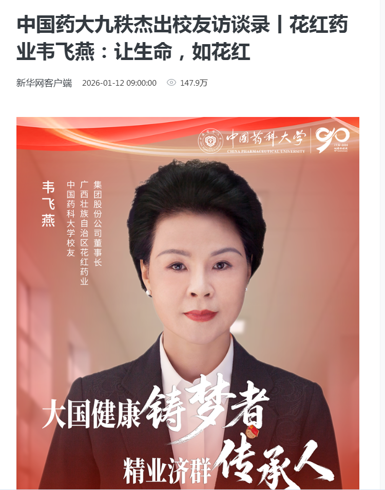 近日,新华社、新华网等中央主流媒体集中报道了花红药业集团董事长、我校杰出校友韦飞燕女士的感人事迹与卓越成就。相关报道以“生命当如花红”为核心主题,深刻诠释了我校学子对生命健康的敬畏、对女性群体的关怀及其对母校的深情回馈,在全网引发热烈反响。